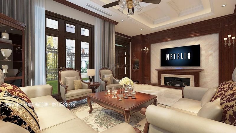 Thể hiện đặc trưng của phong cách tân cổ điển với chạm khắc tinh xảo với mẫu thiết kế phòng khách biệt thự này cũng tương tự như vậy nhưng nổi bật ở vẻ đẹp của gỗ óc chó đã tạo nên không gian biệt thự, nhà phố sang trọng, quý phái.