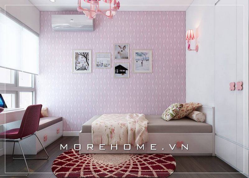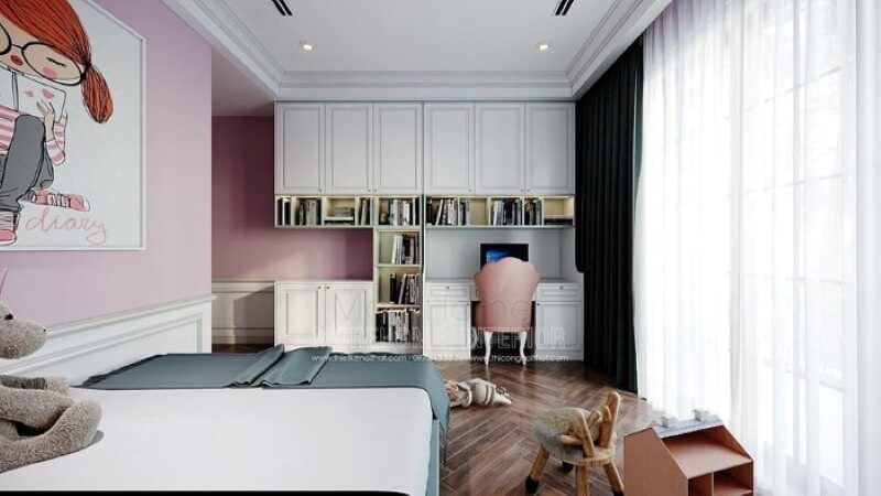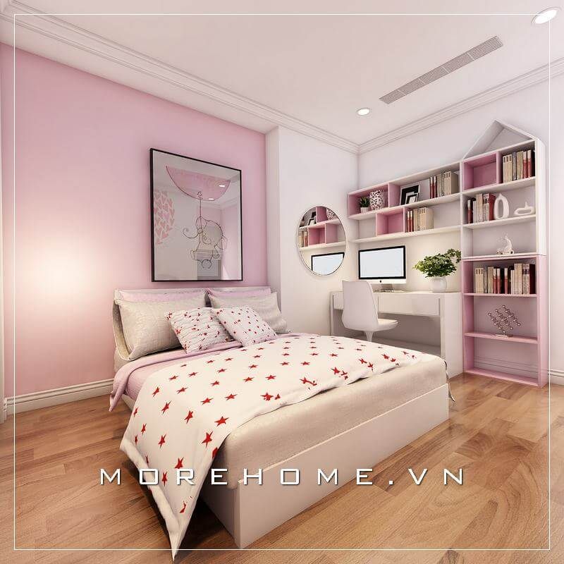 Bố trí nội thất phòng ngủ khoa học và tiện nghi, gam màu trắng - hồng được gia chủ lựa chọn tạo cảm giác mới mẻ và tinh tế phù hợp với phòng ngủ của bé gái