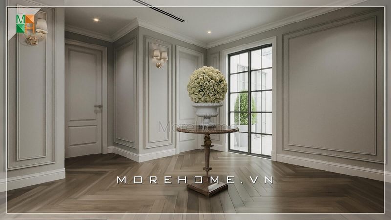 Thiết kế biệt thự, nhà phố với màu trắng tinh tế cao cấp và trung tâm chú ý ở hành lang rộng của ngôi nhà là bàn gỗ óc chó cuốn hút, độc đáo.