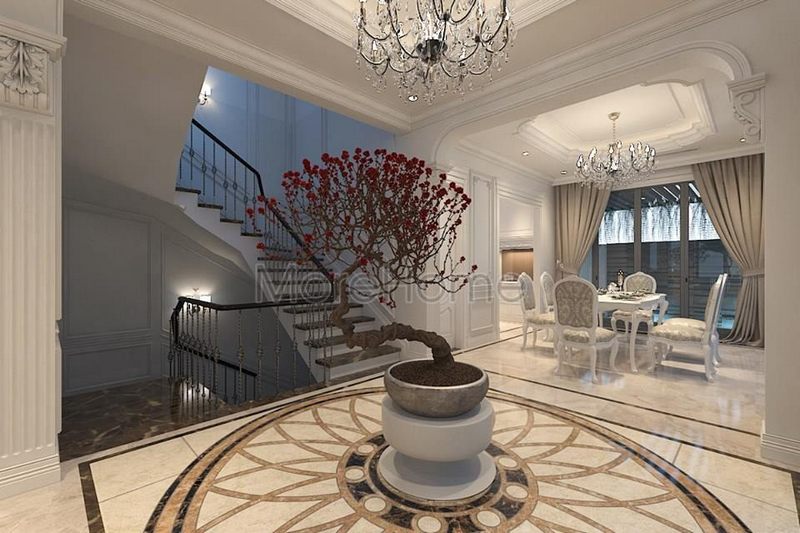 Cầu thang gắn kết các không gian tầng nhà sử dụng kết hợp 2 chất liệu gỗ song sắt sắt tạo nên sự độc hóa thú vị