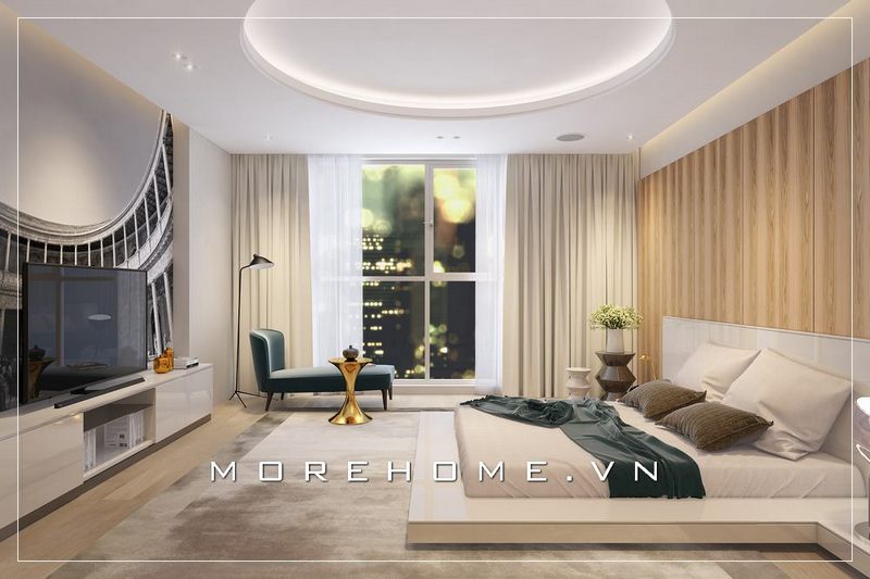 Trang trí nội thất phòng ngủ chung cư cao cấp để tạo ấn tượng hơn, chiếc giường ngủ gỗ óc chó màu nâu sang trọng và tinh tế sẽ làm nổi bật.