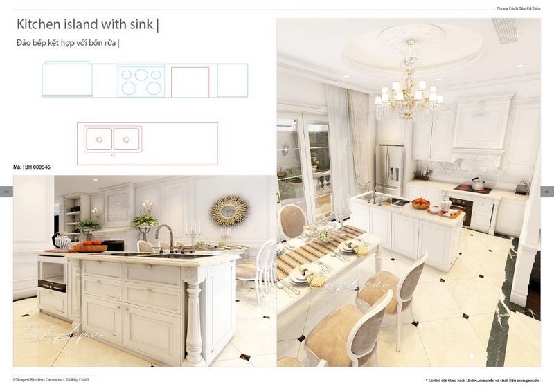 Mẫu thiết kế phòng bếp tân cổ điển màu trắng được nhấn mạnh bởi phần đảo bếp kết hợp với bồn rửa đầy tiện nghi và sự sang trọng.
