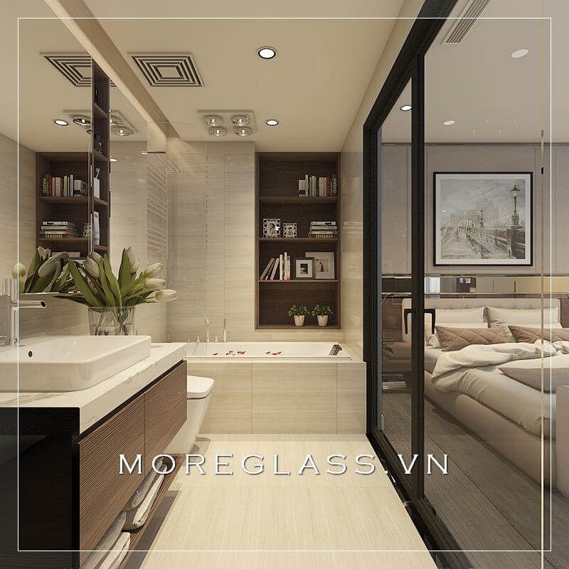 Không gian phòng tắm đẹp với các thiết bị nội thất cao cấp nhưng đơn giản như bồn tắm nằm, kệ tủ gỗ để đồ, gương phòng tắm... đem lại cho người dùng một căn phòng tắm lí tưởng.
