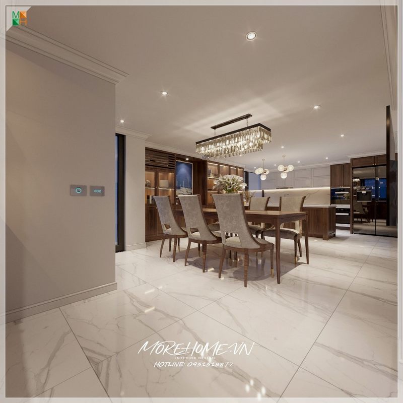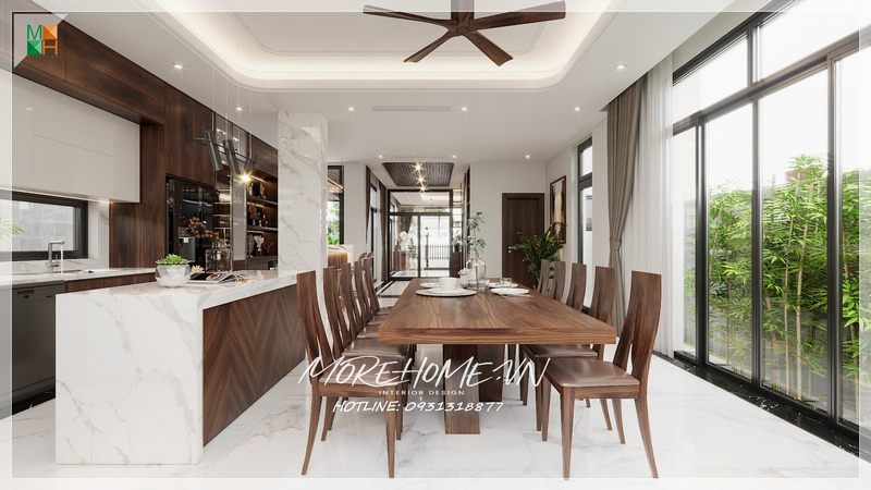 Phòng ăn trong ngôi biệt thự cao cấp được trang bị nội thất gỗ óc chó đồng nhất và đá ốp lát màu trắng tinh tế, tạo nên một không gian hấp dẫn cho gia đình có thể bên nhau quây quần.