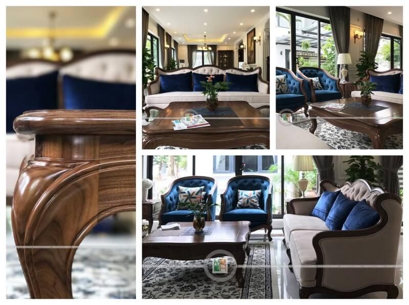 Mẫu sofa phòng khách có thiết kế theo phong cách cổ điển với chất liệu gỗ óc chó tinh tế và đẹp mắt.